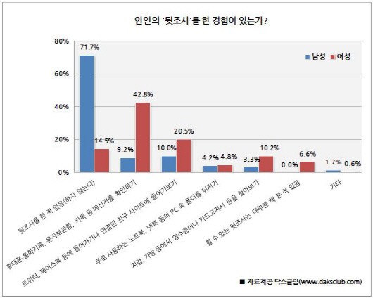 결혼정보회사 닥스클럽(대표이사 유제천)이 미혼남녀 286명(남 120명, 여 166명)을 대상으로 연인의 뒷조사를 한 경험이 있는가에 대해 설문조사 한 결과 미혼남성의 경우 '그렇다'고 답한 비율이 28.3%에 불과한 반면 미혼여성은 남성의 3배가 넘는 85.5%가 연인의 뒷조사를 한 적이 있다고 답했다.