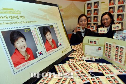 우정사업본부는 21일 오후 서울 충무로 포스트타워 우표박물관에서 오는 25일 발행되는 '제18대 대통령 취임 기념우표' 를 선보였다. 이번에 발행되는 우표는 기념우표 1종 200만장, 시트 1종 20만장, 기념우표첩 1종 1만부이며, 발행일부터 전국 3600여개 우체국에서 구입할 수 있다. 판매가격은 우표 270원, 시트 540원, 기념우표첩 2만원이다./사진=서동일기자