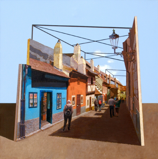 유럽의 유서 깊은 도시 중 하나인 체코 프라하에 가면 옛날옛적 연금술사들이 모여 살았다는 황금소로 초입에 수많은 관광객이 드나드는 집이 하나 있다. '변신'의 작가 프란츠 카프카(1883~1924)의 생가다. 벽면이 온통 푸른색으로 칠해진 그 집은 겉보기엔 작고 초라하지만 내부는 제법 넓고 근사하다. 지난해 2월 서울대 미대를 정년퇴임한 한운성 작가(67)의 '카프카의 집'은 그곳에 다녀온 기억을 토대로 그린 그림이다. 작가는 디지털 카메라에 담아온 여행사진을 캔버스 앞에 놓고 붓질을 시작했다.