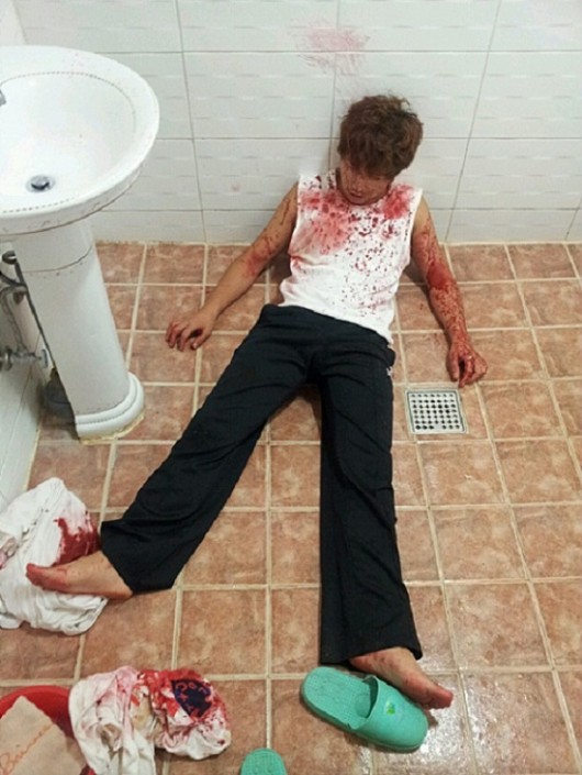 공개된 사진에서 유세윤은 일명 시체놀이를 하는 중이며 화장실에 쓰러진 채 피를 흘리고 있는 모습을 연출해 눈길을 끌었다.