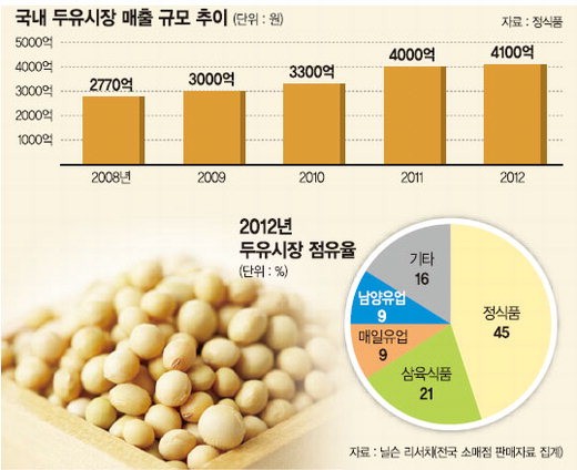지난해 국내 두유시장 규모는 약 4100억원인 것으로 추산된다. 지난 2008년 이후 연평균 10% 이상 지속적으로 성장했다. 지난해엔 경기불황에 따른 소비 위축에도 불구하고 2.5% 성장했다. 정식품은 지난 1973년 두유제품을 처음 상용화한 이후 지금까지 시장 1위 자리를 지키고 있다.