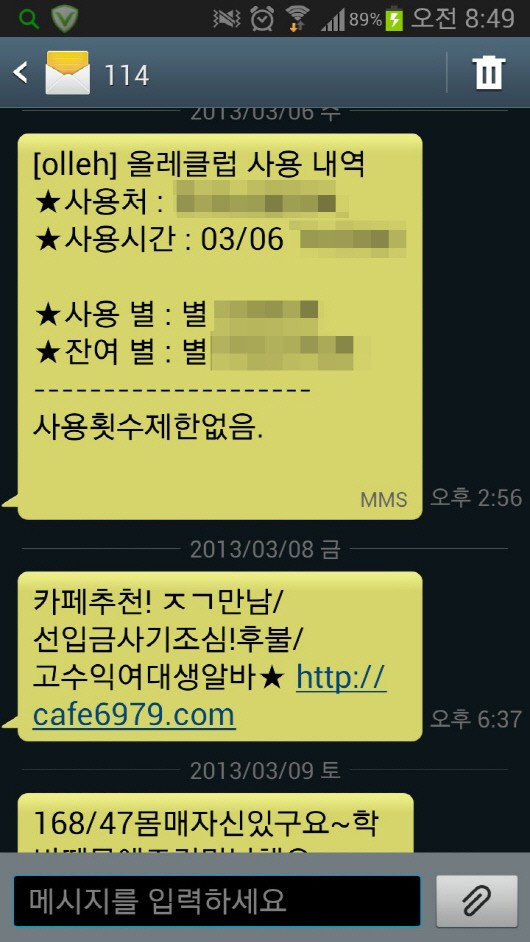 한 누리꾼은 "114번으로 문자가 왔는데 뭔가를 다운로드 받으라고 해서 별 생각 없이 다운로드를 받았다. 당연히 통신사에서 보낸 문자인 줄 알았기 때문에 전혀 의심하지 않았다"면서 "그러나 다운로드를 받아도 따로 보여지는 것은 없었다. 나중에 보니 통화기록에 멀티메일이 1분에 하나씩 거의 30건 정도가 계속 다운로드 되고 있었다"고 말했다.