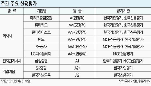 12일 한국기업평가에 따르면 삼성증권의 기업신용등급(ICR)은 AA+(안정적), 기업어음 및 전자단기사채 신용등급은 A1등급을 받았다. 전자단기사채 신용등급 가운데 A1은 적기상환능력이 최고 수준이고, 안정성 또한 높다는 것을 의미한다.