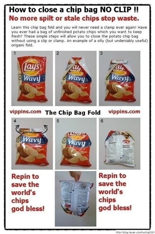 이번에 공개된 ‘과자봉지 봉하는 방법’ 사진에는 과자봉지를 도구없이 봉할 수 있는 방법이 4단계로 설명과 함께 소개돼 있다.