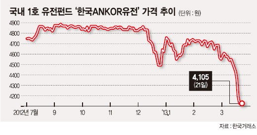 21일 거래소에 따르면 특별자산펀드인 '한국ANKOR유전'은 전일보다 5원(0.12%) 상승한 4105원으로 거래를 마쳤다. 그런데 최근 '한국ANKOR유전' 의 주가는 크게 폭락하고 있다.