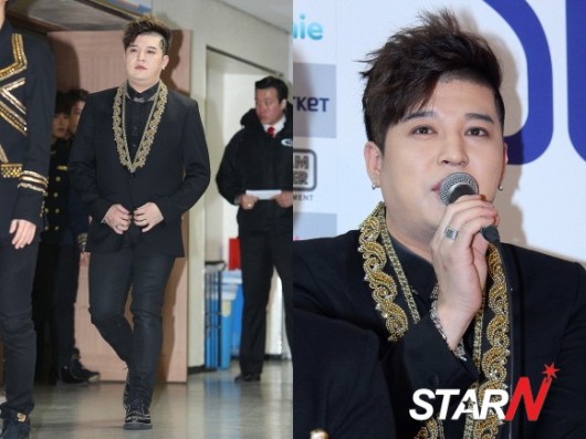 이날 슈퍼주니어는 금색 장식이 멋스러운 블랙 수트를 입고 등장해 취재진들의 플래쉬 세례를 받았다.