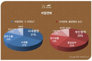 비밀연애 경험자들에게 질문한 결과 이 중 62%가 '사내연애', 38%가 '사외연애'였다. 비밀연애를 하는 이들 중에는 사내연애자가 훨씬 많다는 이야기다.