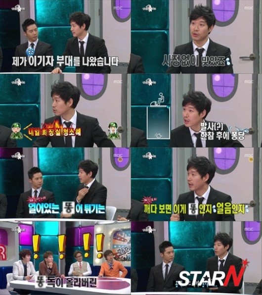 이에 한겨울 재래식 화장실을 치우던 중 꽝꽝 언 대변을 깨자 얼음인지 대변인지 구분이 안가는 파편이 튀었고 유준상은 '이등병의 편지'를 부르고 울면서 똥을 치워야 했다고 말했다.
