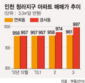 뿐만 아니라 청라지구가 위치한 서구 연희동과 경서동의 전세.매매가도 고공행진 중이다. 경서동의 3.3㎡당 매매가는 1월 957만원에서 2월 974만원으로, 3월에는 997만원으로 껑충 뛰었다. 연희동도 지난 1월 957만원에서 2월 958만원으로, 3월은 961만원으로 올랐다.