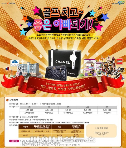 이번 이벤트 참여는 이달 17일부터 다음달 22일까지 골프존 비전 및 리얼 시스템이 설치된 전국 매장에서 로그인 후 스카이 밸리CC, 캐슬파인GC, 다이너스티CC, 웨스트파인GC, 하이원CC 등 기간별 이벤트 코스에서 라운드 하면 된다. 1라운드 중 패밀리존에 3번 안착시키면 1회 성공으로 간주된다. 성공 횟수에 따라 샤넬백 1명, 오크밸리 숙박권 50명, 레고 60명 등 가족을 위한 풍성한 경품을 제공한다. 매주 최다라운드 1위에게는 투어스테이지 드라이버도 주어진다.