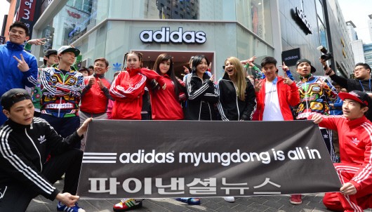 19일 오전 서울 아디다스 명동 플래그십 스토어에서 열린 리뉴얼 오픈 기념 행사에서 그룹 '2NE1' 멤버들과 B-boy팀이 댄스 플래시 몹 이벤트를 진행하고 있다. /사진=박범준기자