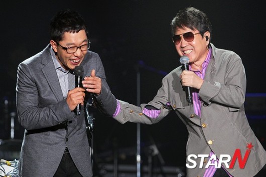 가수 조용필이 23일 오후 서울 송파구 방이동에 위치한 올림픽공원에서 진행된 19집 ‘프리미어 쇼케이스-헬로(Hello)’에서 김제동과 대화를 나누고 있다.