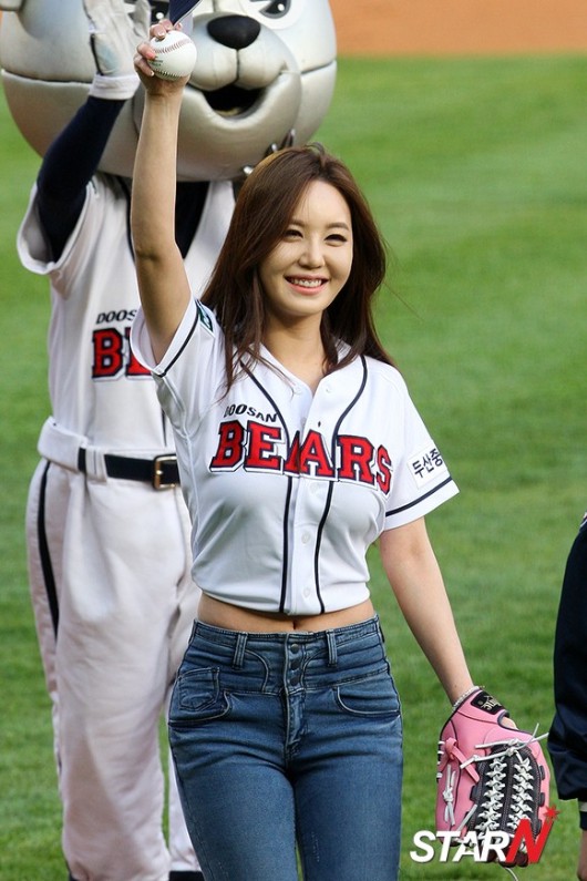 '2013 한국야쿠르트 세븐프로야구' 두산 베어스와 KIA 타이거즈의 경기가 2일 오후 잠실구장에서 열린 가운데 배우 강예빈이 시구를 마치고 그라운드를 내려오고 있다.