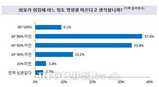 전체 응답으로 봤을 때 외모가 취업에 주는 영향력은 '60~80% 미만' 수준이라는 대답이 37.4%로 가장 많았고, '40~60% 미만'(33.8%), '20~40% 미만'(13.2%), '80~100% 미만'(9.1%), '20% 미만'(3.8%), '전혀 상관없다'(2.7%) 순이었다. 성별로는 '60% 이상'에 표를 던진 비율이 남성이 40.9%, 여성이 51.3%로 남성보다 여성이 외모의 영향력을 더 민감하게 느끼는 것으로 나타났다.
