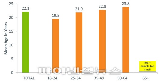 한국의 경우 첫 성경험을 하는 연령이 평균 22.1세로 조사됐다. 연령대 별로 살펴 보면 18~24세 인구는 평균 19.5세, 25~34세는 21.9세, 35~49세는 22.8세, 50~64세는 23.8세로, 연령이 낮아질 수록 처음 성관계를 맺는 시기가 이른 것으로 나타났다.