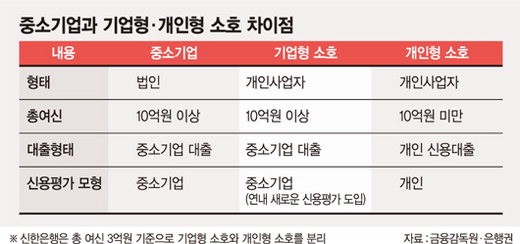 금감원 관계자는 "중기 신용평가 모형을 적용하면 매출과 업종에 따라 불리한 기업형 소호가 나올 수 있어 기업형 소호만의 신용평가 모형을 만들기로 했다"며 "여신 10억원 이하의 자영업자인 개인형 소호는 그대로 개인대출을 받는 것으로 했다"고 말했다.