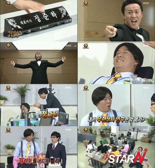 8일 방송된 MBC ‘무한도전’에서 무한상사의 연이은 매출 하락으로 ‘연탄불 후라이’로 대박을 친 정준하가 무한상사를 인수했다.