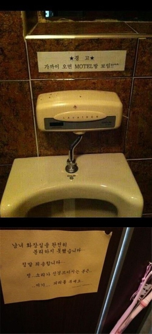 해당 게시물의 첫 사진에는 공용 화장실 남성용 소변기 위에 "가까이 오면 (창문너머로) 모텔 방이 보입니다"라는 문구가 적혀 있다.