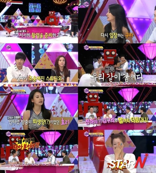 이후 녹화가 시작되고 나서 이효리는 김구라의 어색함을 깨기 위해 먼저 선뜻 포옹을 했지만 김구라는 민망함에 쩔쩔매는 모습을 보였고 앞서 과거 인터넷 방송 활동 당시 이효리에게 독설을 내뱉은 적이 있 김구라는 “제가 일방적으로 잘못을 했다”라며 말을 더듬었다.