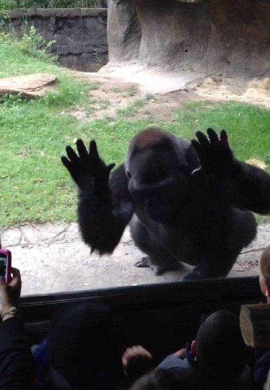 초반에는 아이들이 놀리는데도 의연하게 앉아서 쿨한 모습을 유지하던 고릴라는 이내 아이들의 놀리는 모습이 신경이 쓰였는지 두 손을 들어 유리벽에 얼굴을 바짝 갖다대 귀여운 복수를 하고는 유유히 자리를 피한다. 이를 본 아이들은 질겁해 소리를 지르는 등 뒤로 물러섰다.