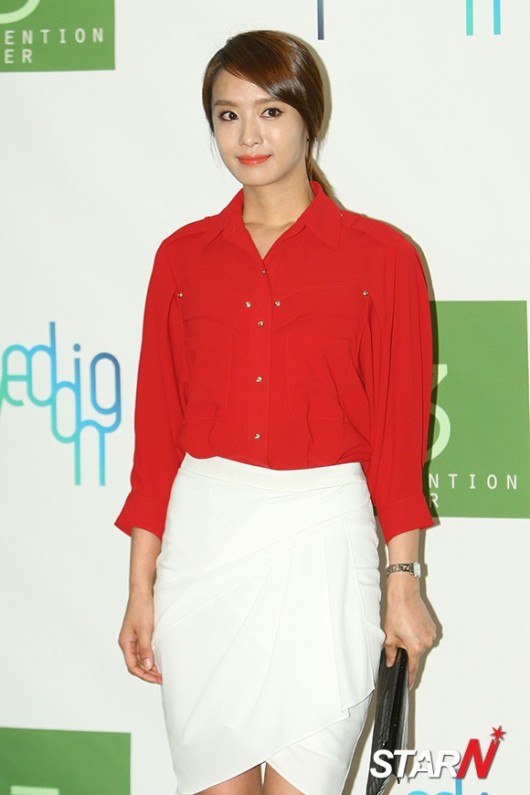 이날 박정아는 짙은 붉은 컬러의 블라우스와 화이트 컬러의 스커트를 매치해 세련된 결혼식 패션을 선보였다.