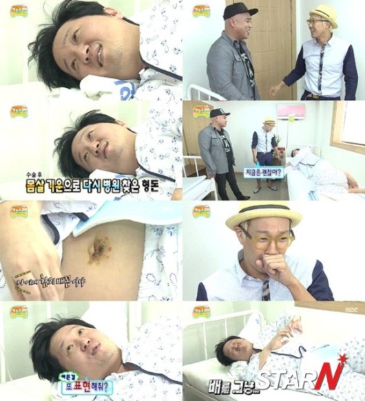 이날 하하와 길은 정형돈을 찾아갔고 정형돈은 병실 침대에 누워 기운없는 목소리로 “나 이제 참외 배꼽 아니야”라며 자신의 배를 보여줬다.