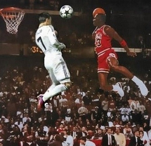 해당 사진은 두 사람의 점프하는 모습을 합성한 것으로 축구선수의 호날두의 점프력이 농구선수 못지 않다는 것을 보여주고 있다.