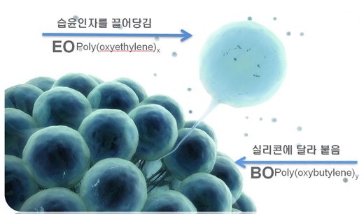 BO 분자는 콘택트렌즈의 소수성 부분(특히 실리콘체인)에 달라붙고 EO 분자는 수분을 잡아당겨 유지하는 기전으로 렌즈 표면에 습윤막을 형성, 유지한다.
