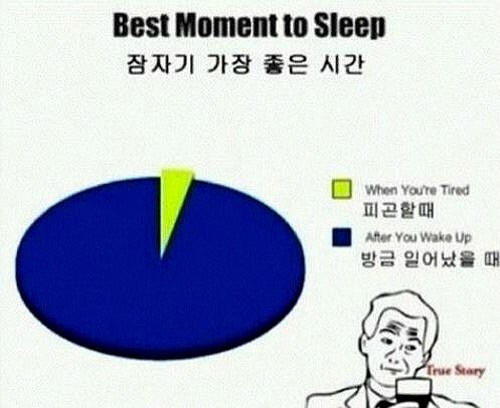 공개된 '알람이 소용없는 이유' 사진에는 잠자기 가장 좋은 시간이 나타나 있다. 잠자기 가장 좋은 시간은 '피곤할 때'보다 '방금 일어났을 때'라고 설명하고 있다.이는 알람을 듣고 일어났을 때가 가장 잠자기 좋은 시간이라는 것으로 비유한 것으로 보여진다.