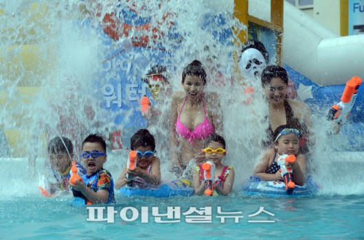 무더위와 휴가철이 한창인 4일 오전 서울 용산구 현대아이파크몰 워터파크에서 어린이들이 악당 캐릭터로 분장한 도우미들과 물놀이를 즐기고 있다.