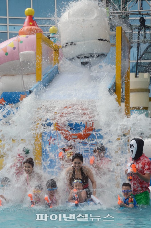 무더위와 휴가철이 한창인 4일 오전 서울 용산구 현대아이파크몰 워터파크에서 어린이들이 악당 캐릭터로 분장한 도우미들과 물놀이를 즐기고 있다.