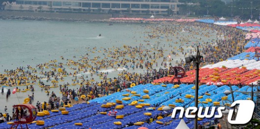 33도 안팎의 높은 기온을 보인 해운대해수욕장에는 부산시가 주최한 바다축제 등 다양한 이벤트와 맞물려 이날 70만명의 인파가 몰려 큰 혼잡을 빚었다.