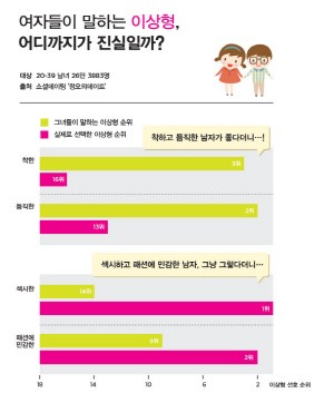 이어 실제로 여성들이 선택한 남자들의 스타일 순위를 살펴보면, 선호 최상위권에 들었던 '듬직한 남자'와 '착한 남자'는 각각 13위, 16위에 그쳐, 여성들이 말하는 자신의 이상형과 실제로 선호하는 스타일이 매우 일치하지 않음을 알 수 있다.