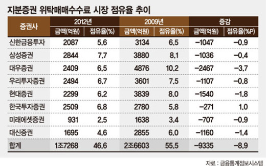 14일 금융감독원에 따르면 2012회계연도 국내 주요 증권사(KDB대우증권, 삼성증권, 우리투자증권, 한국투자증권, 미래에셋증권, 대신증권, 신한금융투자, 현대증권) 8개사가 차지한 위탁매매수수료 시장점유율은 46.6%를 기록했다. 이는 4년 전인 2009회계연도의 55.5%보다 8.9%포인트 감소한 것이다.