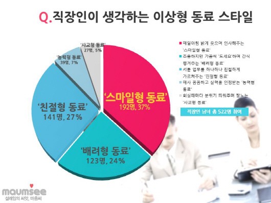 소셜데이팅 서비스업체 마음씨가 최근 20~30대 남녀 직장인 522명을 대상으로 '직장 내 이상형 동료'에 대한 설문조사를 실시한 결과 전체 응답자의 37%가 매일 아침 밝게 웃으며 인사해주는 '스마일형 동료'를 1위로 꼽았다.