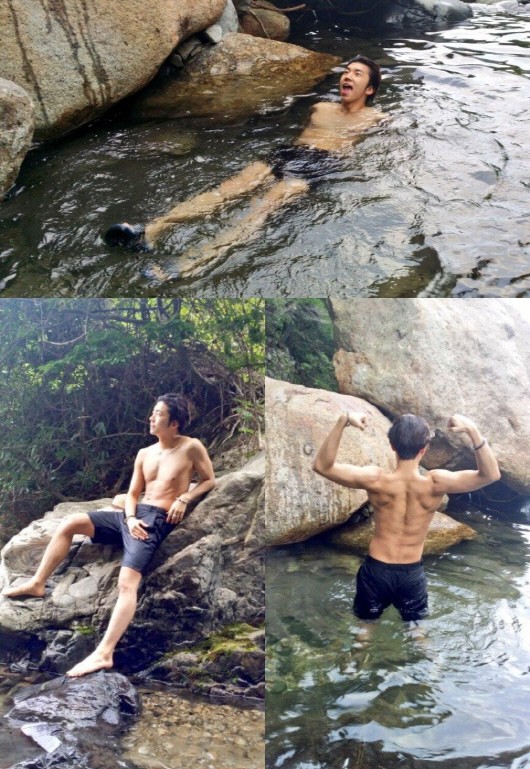 공개된 사진 속 장우영은 계곡에서 물놀이를 하고 있는 모습이다. 물 속에서 장난을 치거나 바위에 기대 포즈를 취하고 있다.