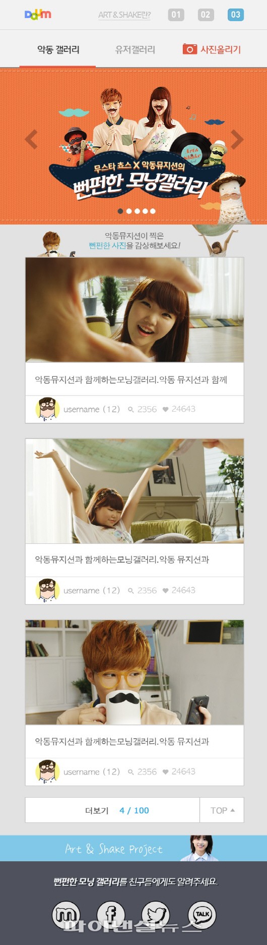 다음커뮤니케이션은 '모으다. 잇다. 흔들다' 캠페인의 일환으로 가수 악동뮤지션과 '무스타쵸스' 최은솔 작가가 참여하는 '아트&쉐이크 프로젝트 시즌3'를 시작한다고 20일 밝혔다.