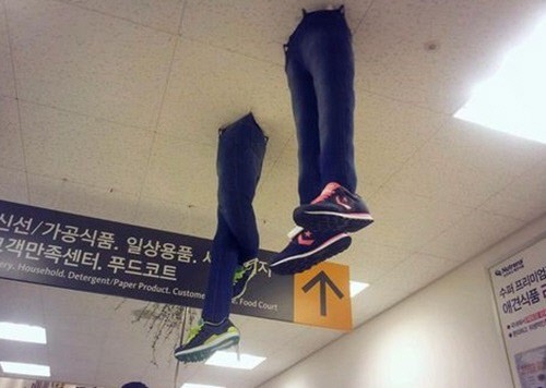그러나 일반적인 마네킹과는 달리 천장 아래로 다리만 보여져 마치 천장을 뚫고 나온 듯한 모습으로 보는 이들을 놀라게 했다.