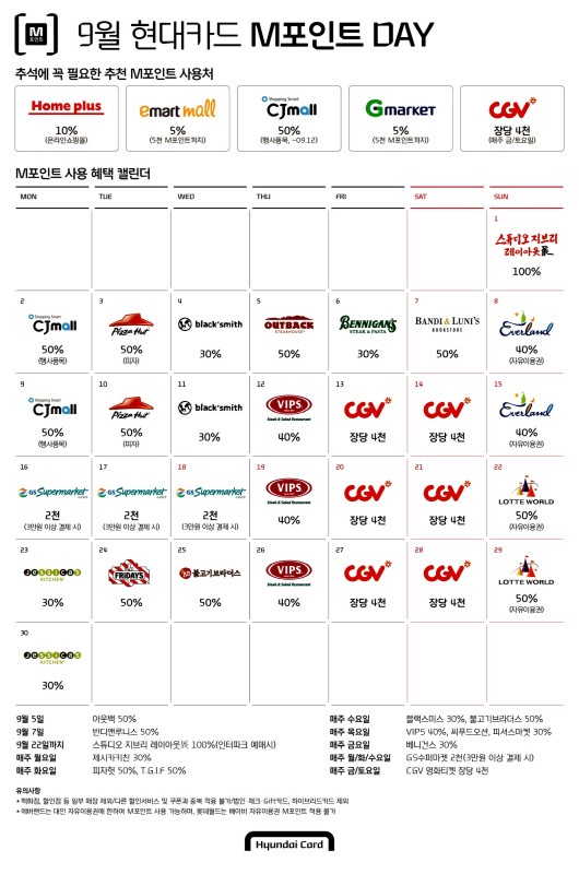 현대카드가 9월 추석을 앞두고 대형 할인점과 홈쇼핑, 온라인쇼핑몰, 문화, 외식 등 다양한 분야에서 M포인트 사용과 특별 할인 혜택 등을 제공하는 이벤트를 시행한다고 30일 밝혔다.