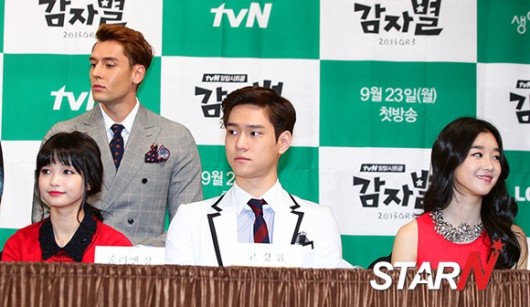 배우 하연수, 고경표, 서예지가 16일 오후 서울 강남구 논현동에 위치한 임패리얼 팰리스에서 진행된 tvN 새 일일 시트콤 '감자별 2013QR3' 제작발표회에 참석해 취재진을 바라보고 있다.