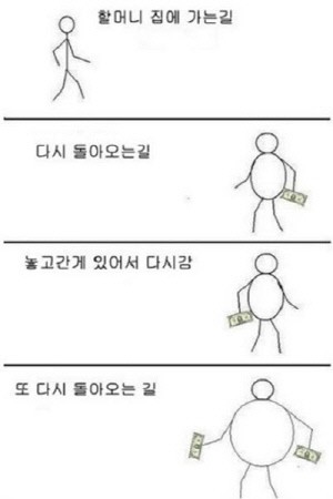 처음 할머니 집으로 갈 때 손자의 모습은 평범하다. 하지만 돌아올 때는 배가 부른 상태에서 한 손에는 용돈이 쥐어져 있다.
