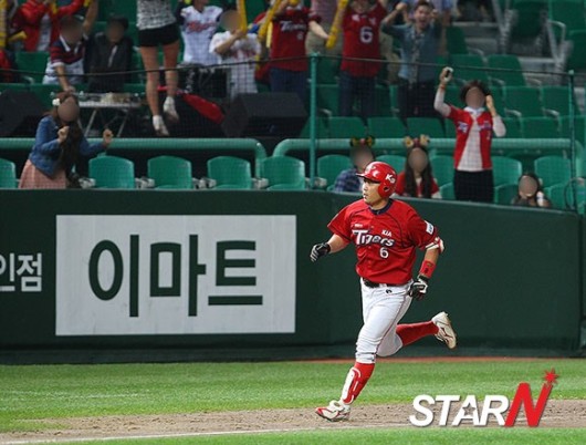 '2013 한국야쿠르트 세븐프로야구' SK 와이번스와 KIA 타이거즈의 경기가 27일 오후 인천 문학구장에서 열린 가운데 7회초 선두타자로 나선 KIA 박기남이 SK 선발 레이예스를 상대로 솔로홈런을 날리고 그라운드를 돌고 있다.