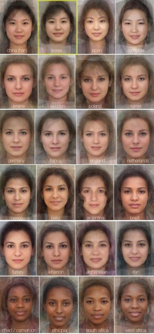 공개된 '세계 여성 평균 얼굴'에는 영국 글래스고 대학 심리학 연구팀이 각국 여성 얼굴의 공통점을 뽑아내 합성한 얼굴이 나와 있다.