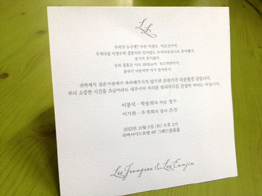 이어 "귀하께서 결혼 식장에서 축하해주시지 않으면 분위기가 다운될 것 같습니다. 부디 소중한 시간을 조금이라도 내주시어 자리를 빛내주시길 간절히 바라는 바입니다"라고 덧붙였다.