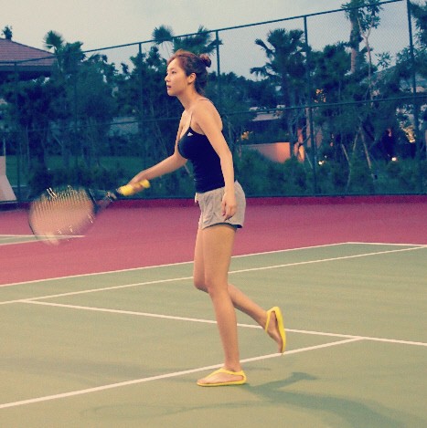 공개된 사진 속 이수정은 리조트 테니스 장에서 운동을 하고 있다. 이수정은 깊게 패인 민소매 상의와 핫팬츠를 입고 건강미 넘치는 몸매를 과시했다.