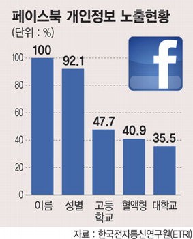 사이버보안연구단 조사에 따르면 페이스북의 경우 성별(92%), 고등학교(47%), 혈액형(40%), 관심사(19%), 좋아하는 음악(14%) 순으로 개인 신상 정보가 노출된 것으로 나타났다.