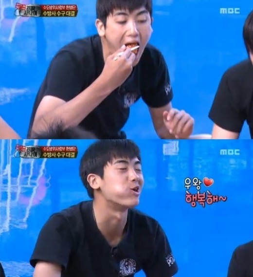 이날 수구 대결에서 승리한 ‘진짜사나이’ 팀은 둘러 앉아 군부대에서는 보기 힘든 닭강정을 나눠 먹는 시간을 가졌다.
