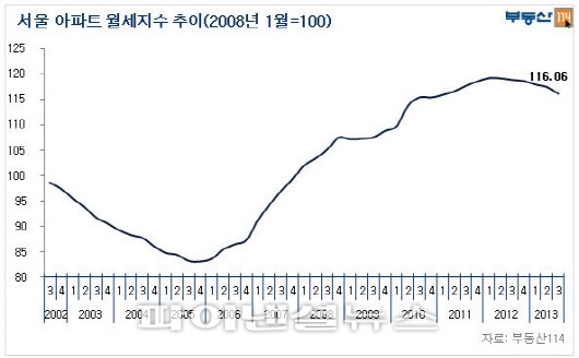 15일 부동산 114(www.r114.com)의 아파트가격종합지수(KOAPI)에 따르면 서울 아파트 월세지수는 올 3분기 116.06으로, 전분기 117.35에 비해 1.29p 하락했다.