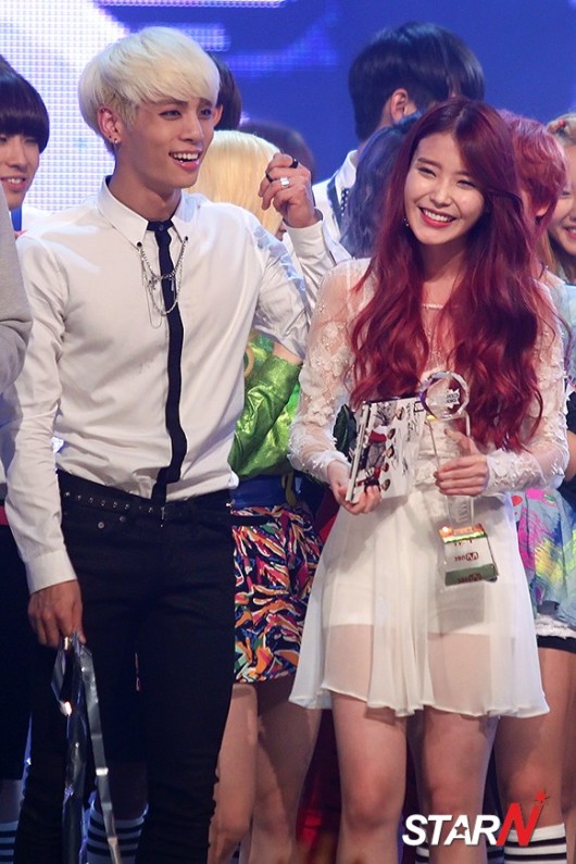 가수 아이유, 샤이니 종현이 17일 오후 서울 마포구 상암동에 위치한 CJ E&M 센터에서 진행된 Mnet 'M!Conountdown (엠카운트다운/354회)'에서 1위 수상 후 기뻐하고 있다.