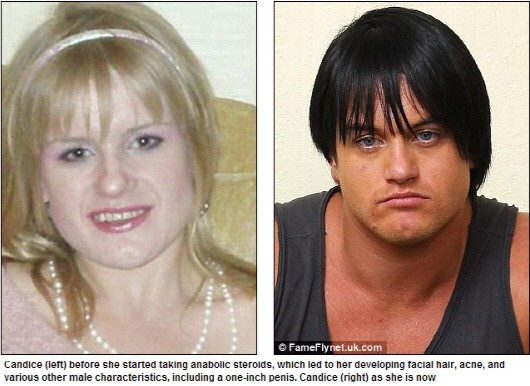 영국 일간지 데일리메일 인터넷판은 22일(현지시간) 캔디스 암스트롱이라는 28세 여성이 아나볼릭 스테로이드(근육 증강제) 남용으로 남자의 몸을 갖게 됐다며 이같이 보도했다.